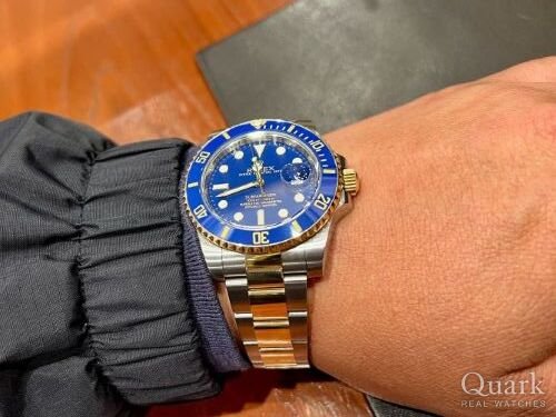T様、この度はクォーク広島店をご利用いただき誠にありがとうございます。こちらの青サブは一世代前の生産初期の青サブで、文字盤がラッカー仕上げとなっております。後期と現行モデルは、サンレイ仕上げへ変わっておりますので比較的珍しい個体です。高級感とカジュアルさを兼ね備え、美しくもかっこいい青サブがT様の腕元にしっかりと馴染んでおりました。ブレスの調整・洗浄も何時でも無料で承っております。困った際には是非お近くのクォークまでご来店くださいませ。