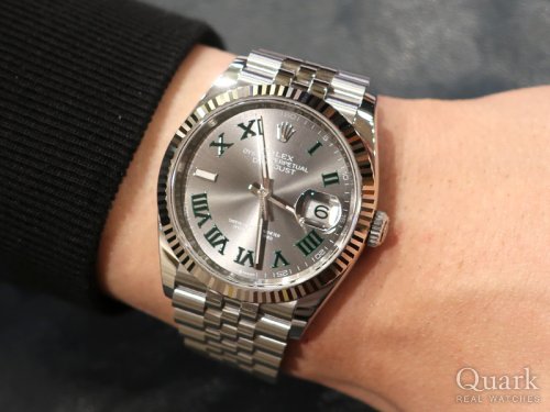 T様、いつもクォーク仙台店をご利用いただきまして誠にありがとうございます。この度お選びいただきました『DATEJUST36 Ref.126234』のスレートローマダイヤルは抜群の魅力を放つダイヤルカラーに惹かれる1本です。落ち着いたスレートカラーダイヤル上に、コーポレートカラーのグリーンローマがバランス良く配置されており、個性的でお洒落な雰囲気がございます。連続した立体的な山型のカットが光の反射を生み出し、時計を華やかに彩るフルーテッドベゼル×細やかな作りで高いフィット感を実現し、高級さを感じられるジュビリーブレスというデイトジャストの伝統的な仕様の組み合わせも美しく、クラシカルでドレッシーな印象ながら、スポーティさも併せ持つ人気の1本です。ご来店前のご検討から、まさに狙い通りの1本だったかと存じますが、満足と仰っていただけて何よりでございました。是非末永くご愛用くださいますと幸いです。なお、私どもではブレス洗浄サービスを行っておりますので、お近くにお立ち寄りの際には、お気軽にご用命くださいませ。今後とも末永いお付き合いのほど、よろしくお願い申し上げます。