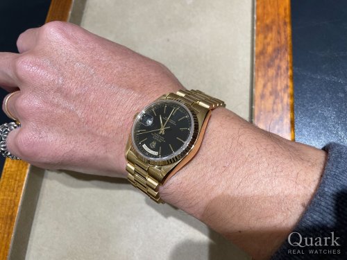 N様 この度はクォークをご利用いただきありがとうございます。今回お求め頂きましたモデル、デイデイト(Ref.18038・ブラック)ですが、ハイクラスヴィンテージになり、マニアからの支持と根強い人気のあるモデルです。わずかに金焼けもしていてとても雰囲気の良い個体でした。そして何より希少なブラック文字盤ということで、思い入れのある1本になること間違いなしです。こうして販売になったのはN様の引き寄せる力だと思います。とてもお似合いでした。ヴィンテージは唯一無二で出会いが大事です。タイミング良くご案内出来て嬉しく思います。これからのロレックスライフをお楽しみください。アフターサービスなどはクォーク全店舗でも受付可能でございますのでご安心ください。また全支店でブレス洗浄サービスもありますので、またお近くに来られた際には是非、遊びに来てください。今後とも末永いお付き合いの程、よろしくお願い致します。