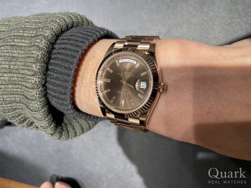 H様 この度は数ある時計店からクォーク名古屋駅店をご利用いただき、また定年記念の図らずもバレンタインデーの日にチョコレートダイヤルのDAY-DATEをご購入いただき誠にありがとうございます。ご購入いただきました『Ref.228235A』チョコレート10Pダイヤ文字盤は2015年に発表されたDAY-DATE 40でございます。