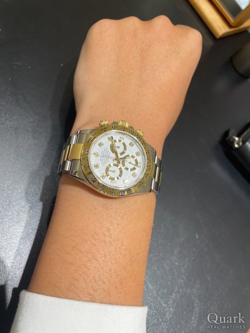 K様 この度はクォークをご利用いただきありがとうございます。今回お求め頂きましたモデル、デイトナ(Ref.116503G)ホワイト文字盤ですが、流通量が少なく希少なモデルでございます。デイトナでダイヤ付きのダイヤルは他にも何種類かありますが、ホワイト文字盤は爽やかで着用しやすいカラーだと思います。タイミングよくご案内出来て良かったです。本当に中々見ないダイヤルですのでK様の引き寄せる力だと思います。これからのロレックスライフを存分にお楽しみください。アフターサービスなどはクォーク全店舗でも受付可能でございますのでご安心ください。また全支店でブレス洗浄サービスもありますので、またお近くに来られた際には是非、遊びに来てください。今後とも末永いお付き合いの程、よろしくお願い致します。
