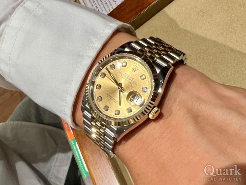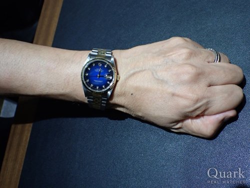 F様 この度はクォーク静岡店をご利用いただき誠にありがとうございます。F様とお話しておりましたら、後悔してほしくないという気持ちがどんどん膨らんでしまいました(笑)。結果何度もご来店をお願いしてしまいましたが、ご満足いただけて私も嬉しいです。お選びいただきましたデイトジャストはイエローゴールドとダイヤモンドの組み合わせ、ほど良い煌びやかさに品のある紳士的な印象がカッコ良いです★周りの方とのロレックストークもさらに盛り上がりそうですね!店頭にてブレス洗浄、サイズ調整を無料で承りますので、またお店にも遊びにきてくださいね。それでは今後とも末永いお付き合いのほど、よろしくお願い申し上げます。