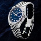 サンレイ仕上げのブルーダイヤルに、10Pのダイヤモンド、人気のフルーテッド×ジュビリーを組み合わせた、煌びやかな一本です。