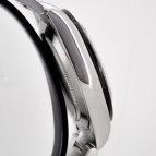 1965年に誕生したプラスチックベゼルを彷彿とさせるセラミックベゼルは、耐蝕性と耐傷性に優れ、紫外線による影響を受けにくく、PVD(物理蒸着)加工により、プラチナの薄い層でコーティングされたタキメーター目盛りが高い視認性を実現している。