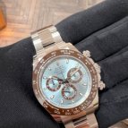 デイトナで初となるプラチナ仕様のRef.116506は、チェスナットブラウンという絶妙なカラーリングのセラミック製タキメーターベゼルを搭載し注目を集めた。また、プラチナモデル固有のステイタス性の高いアイスブルーダイヤルが採用され、インダイヤルの枠は、ベゼルと同色でコーディネートされている。ロレックススポーツ最高峰モデルと最高級貴金属プラチナの組み合わせは、まさにデイトナ50周年に相応しい気品溢れるモデルとなっている。