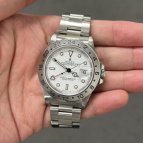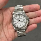 ホワイト文字盤のスポーツモデルが欲しかったのですが、種類は意外と少なく、デイトナは予算オーバーで手頃なものを探していたところエクスプローラーIIを発見。現行モデルとも悩みましたが、私の手首にフィットするのはコチラでした。ホワイト文字盤は清潔感があって、スーツにも合わせやすく重宝しています。