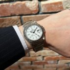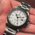 ホワイト文字盤のスポーツモデルが欲しかったのですが、種類は意外と少なく、デイトナは予算オーバーで手頃なものを探していたところエクスプローラーIIを発見。現行モデルとも悩みましたが、私の手首にフィットするのはコチラでした。ホワイト文字盤は清潔感があって、スーツにも合わせやすく重宝しています。