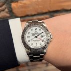 ホワイト文字盤のスポーツモデルが欲しかったのですが、種類は意外と少なく、デイトナは予算オーバーで手頃なものを探していたところエクスプローラーIIを発見。現行モデルとも悩みましたが、私の手首にフィットするのはコチラでした。ホワイト文字盤は清潔感があって、スーツにも合わせやすく重宝しています。