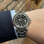 ホワイト文字盤のスポーツモデルが欲しかったのですが、種類は意外と少なく、デイトナは予算オーバーで手頃なものを探していたところエクスプローラーIIを発見。現行モデルとも悩みましたが、私の手首にフィットするのはコチラでした。ホワイト文字盤は清潔感があって、スーツにも合わせやすく重宝しています。