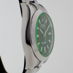 アニバーサリーモデルとして発表されたRef.116400GVは、ロレックスのコーポレートカラーとなるグリーンが採用された、グリーンサファイアクリスタル仕様が最大の特徴。このグリーンサファイアクリスタルが、一般的なサファイアクリスタルと異なる点は二つ。