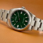 新色のグリーン(ロレックスカラー)が気に入って購入を決めました。大き過ぎず、使いやすい36ミリ径のケースサイズも好みです。