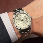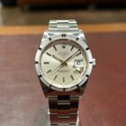 人気の高いシルバーダイヤル。立体感のあるエンジンターンドベゼルとオイスターブレスの組み合わせです。2026年1月にオーバーホール・外装仕上げを行っており、ブレスレットに多少の小傷はございますが目立つものではなく全体的に綺麗な状態です。