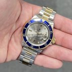 スポーティーなイメージのあるサブマリーナですが、この一本はラグジュアリーな仕様となっております。6・9・12時にブルーサファイア、そして8箇所にダイヤモンドが付いているダイヤ...